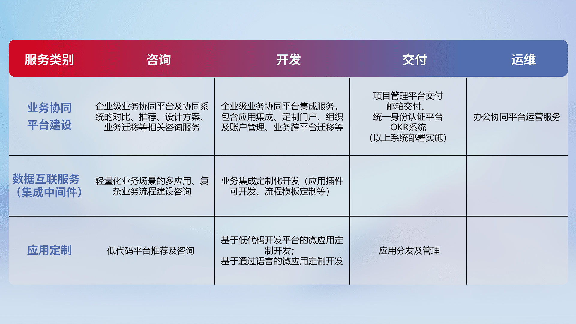 针对钉钉、、、企微、、、IDaas等平台级产品提供产品的规划、、、方案、、、交付、、、定制化开发等服务,,,,实现如统一协同办公、、智能客户服务、、混合会议管理、、、智能数据查询、、等业务场景,,,,实现数字化转型。。。